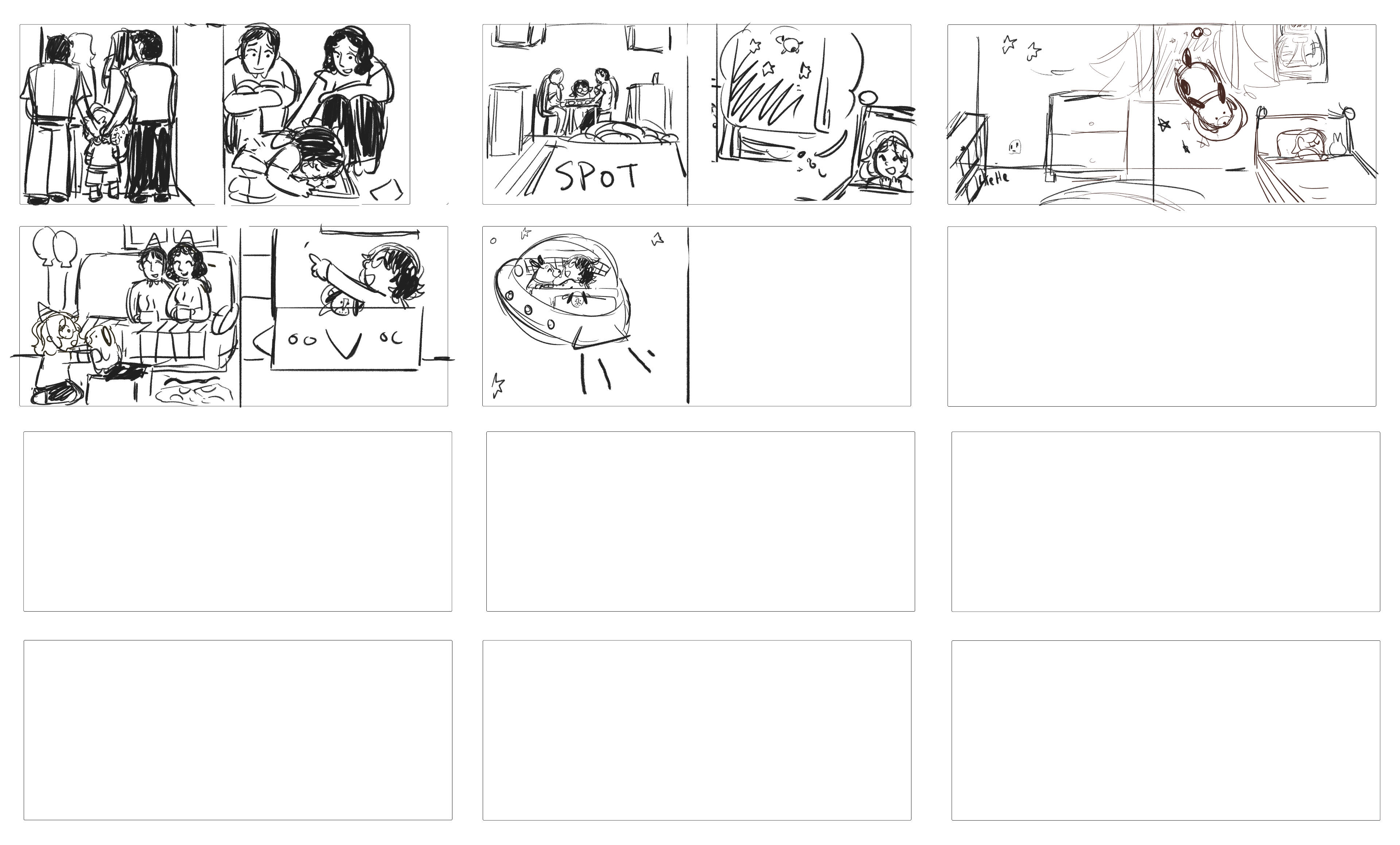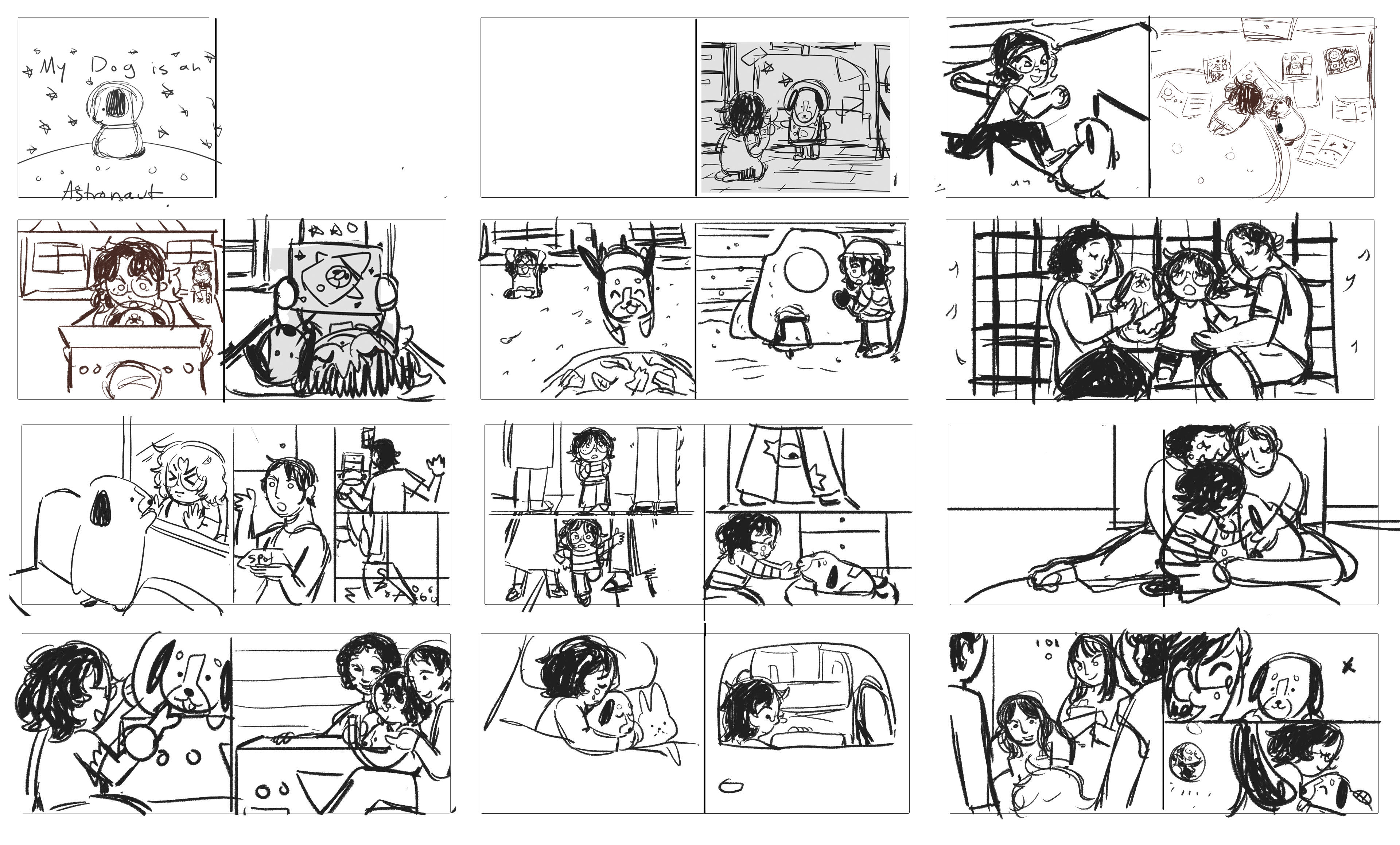 "Spot the astronaut dog" (2025) (cleaned sketches, children's book about dealing with the loss of apet)10 x 8 inches digital, Photoshop
